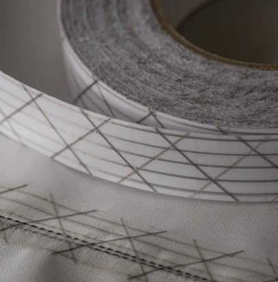 1. Ultra™ ファイバーの格子: 同じ重量比で鋼鉄の約15倍の強度を誇るUltra™繊維を、縦方向(ワープ)と斜め方向(バイアス)に張り巡らせています。これにより、テープ自体の伸びを極限まで抑え、圧倒的な引き裂き強度を発揮します。